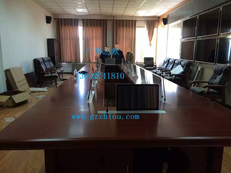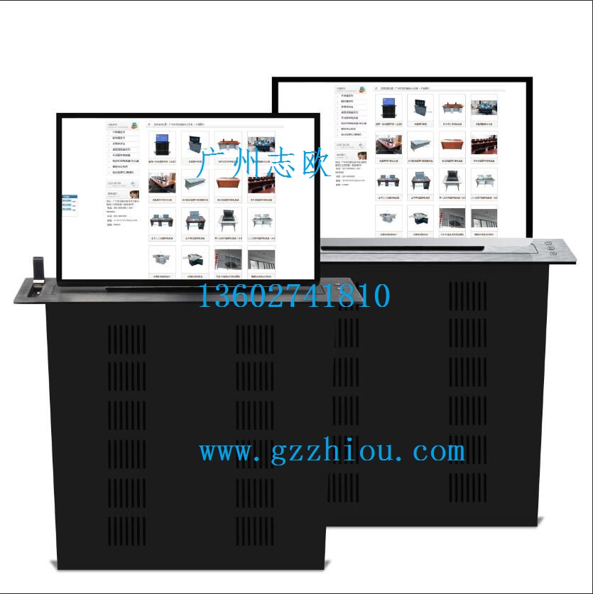 當需要用時隱藏在電腦桌內的升降機把顯示屏從會議桌下面自動升到桌面并仰成一成角度(產品也可以手動調節仰角度):當不使用時顯示屏可自動下降隱藏于電腦桌內部,并自動關門使桌面保存平整,且液晶屏自動斷開電源,從而實現會議高效、桌面美觀、節省空間的目的,使用起來非常方便。具有防盜、防塵保持桌面平整, 美化桌面等功能;