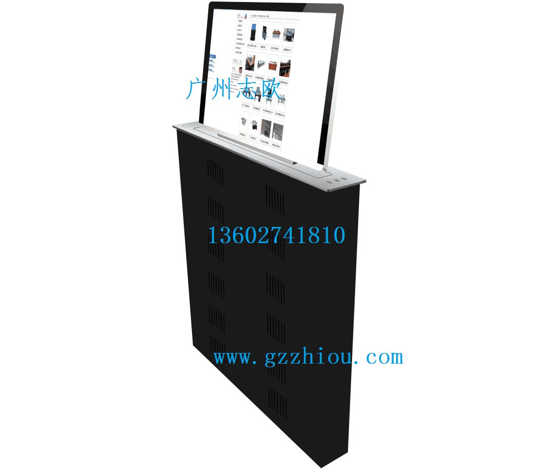 產品特點:, 在液晶屏的上升過程中,裝面板自動打開,液晶屏直立伸出桌面并自動接通電源,自動仰成一定角度。下降時液晶屏自動調整為直立狀態,自斷電源。液晶屏電流自動切斷并開始下降,液晶屏完全下降裝飾板自動合起